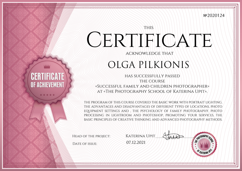I study photography at Katerina Upit school from Ukraine and at Margarita Kareva school from Russia. Please see my diplomas.